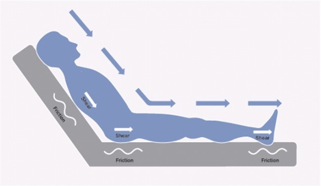 Friction is the resistance to motion of the external tissue sliding in a direction parallel to the support surface. Friction may contribute separately to pressure ulcers by stripping superficial skin layers and causing ulceration. The heels are especially at risk particularly when a person is being repositioned up the bed. Usually occurs at anatomical sites subjected to frequent friction e.g. the heels or sacrum. Causes external skin damage, such as blistering or breaks.